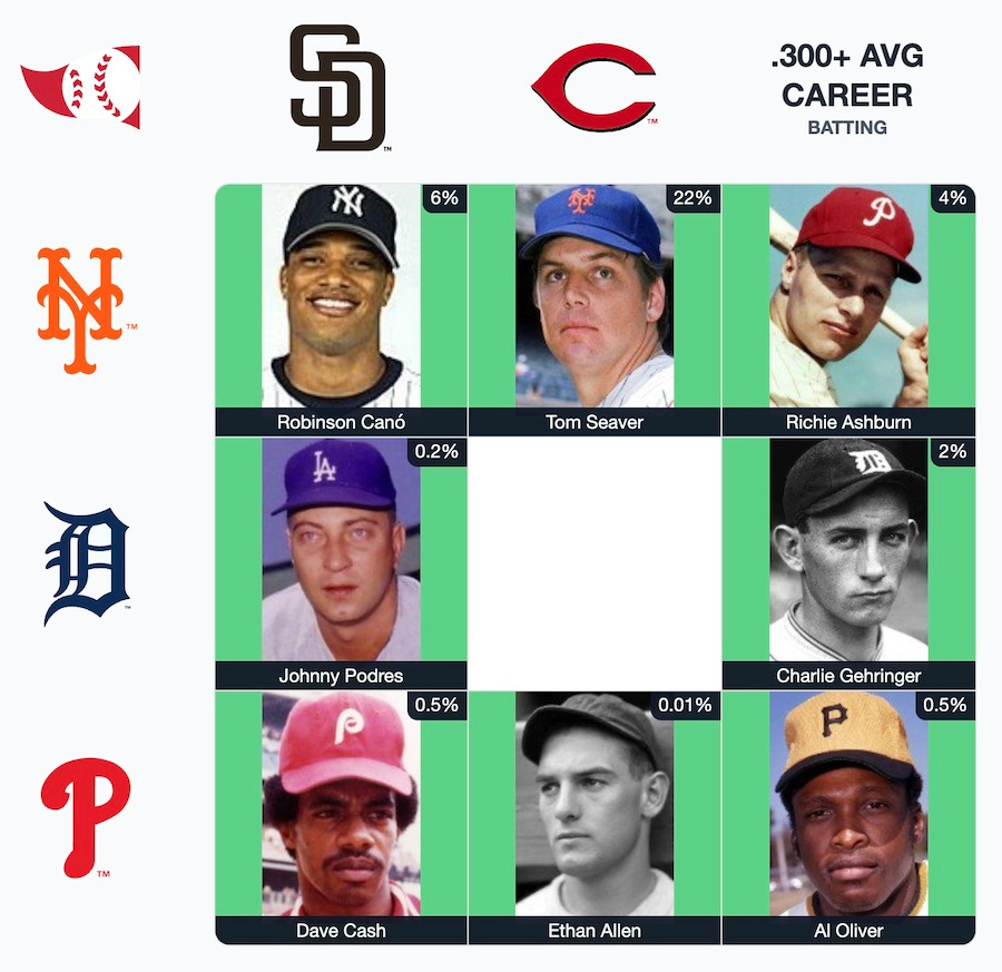 Richie Ashburn and the .300 column: The big question was whether I’d choose Ashburn for the Phillies, his HOF team, or the Mets, his “Yo la tengo” team. Remembering Al Oliver for Phils/.300 sealed the deal. Gehringer’s .300 was just an educated guess about a HOFer who played in an offensive era. But it could’ve been wrong. He was a great defensive second baseman, so maybe he got by on that? Nope: .320 career. He hit .300+ every year but one from 1927 to 1940—and even that year he hit .298.